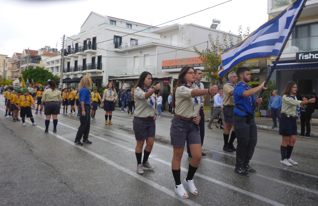 parade begins, it starts to rain, and strongly. School children are drenched,